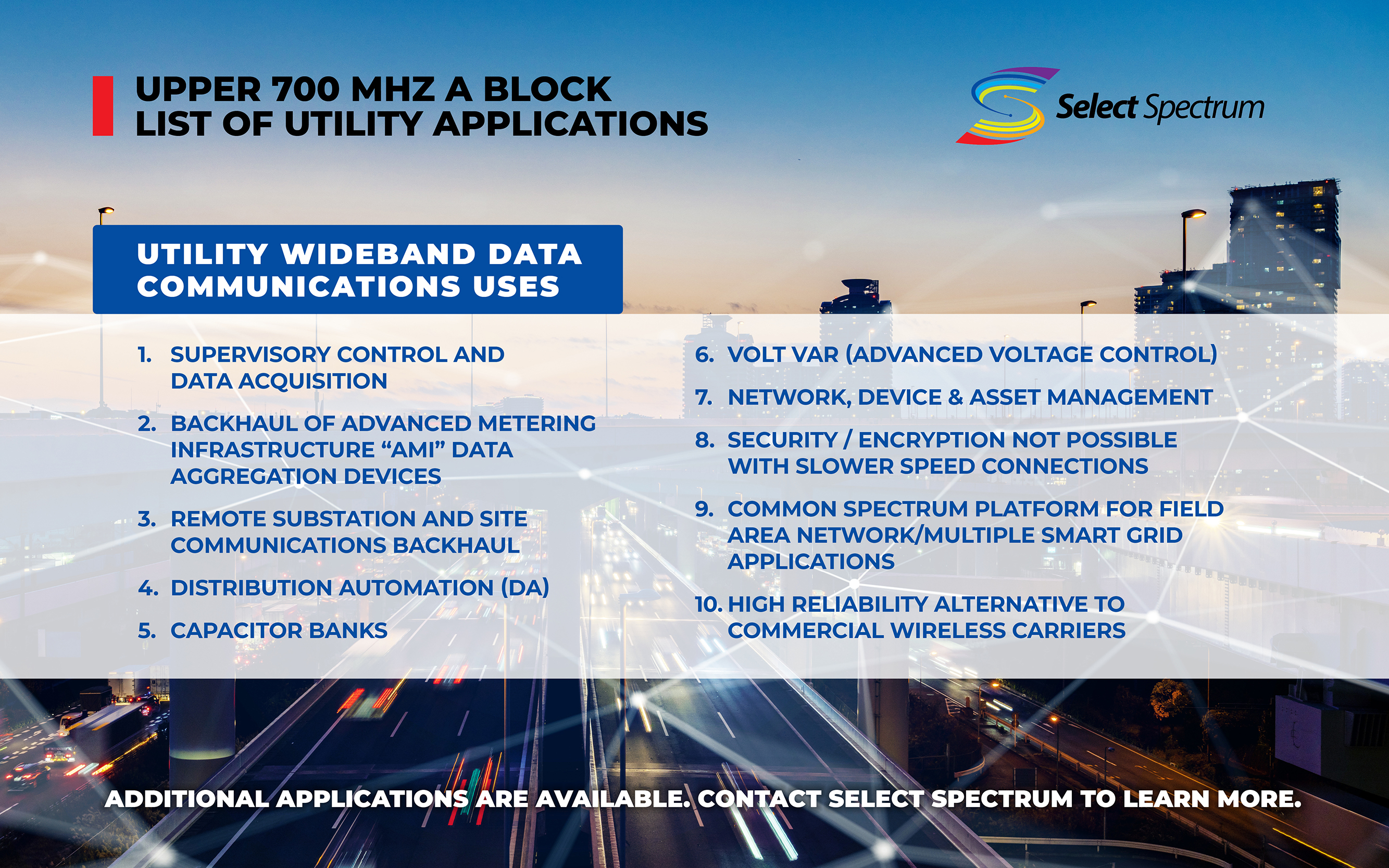 Select Spectrum offers licensed spectrum in the Upper 700 MHz A Block. The band is ideal for LTE Narrowband-Internet of Things (NB-IoT), Supervisory Control and Data Acquisition (SCADA), Distribution Automation (DA), and many other Voice and Data applications and is predominantly used by electric utilities, petrochemical firms, and rail line organizations.